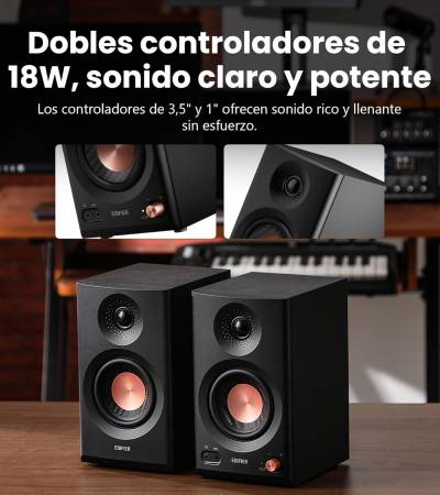Potencia RMS 18W x 2: alcanza hasta 92.5 dB SPL a 1 metro; woofers de 3.5" y tweeters de cúpula de seda de 1" para evitar distorsión.