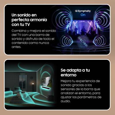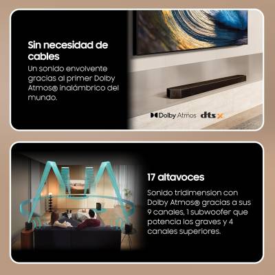 Modelo del 2024. Dolby Atmos y DTS:X inalámbrico, Q-Symphony. 9.1.4 Canales (17 altavoces en total: 9 frontales, 1 subwoofer, 4 altavoces ascendentes e inalámbricos traseros) con 540W RMS (incluyendo subwoofer de 160W). SpaceFit Sound Pro y Compatible con asistentes de Voz. Conexiones HDMI eARC, Wi‑Fi, Bluetooth 5.2, AirPlay 2, Chromecast, y control por voz con Alexa o Google Assistant. Dimensiones: Barra de 111 cm y 5,4 kg de peso, subwoofer de 21 × 40,3 × 40,3 cm y 9,8 kg de peso.